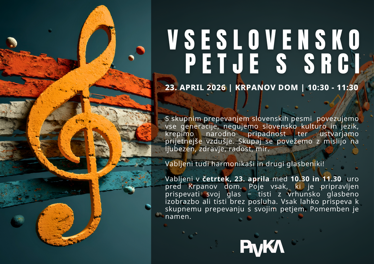 Vabljeni v četrtek, 23. aprila med 10.30 in 11.30 uro pred Krpanov dom. Poje vsak, ki je pripravljen prispevati svoj glas − tisti z vrhunsko glasbeno izobrazbo ali tisti brez posluha. Vsak lahko prispeva k skupnemu prepevanju s svojim petjem. Pomemben je namen.