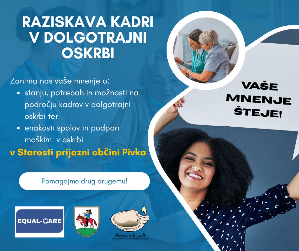 V občini Pivka želimo bolje razumeti stanje, potrebe in možnosti na področju kadrov v dolgotrajni oskrbi. Vabimo vas k izpolnitvi ankete, ki jo izvajamo v sodelovanju z Inštitutom Antona Trstenjaka in v okviru evropskega projekta Equal Care.