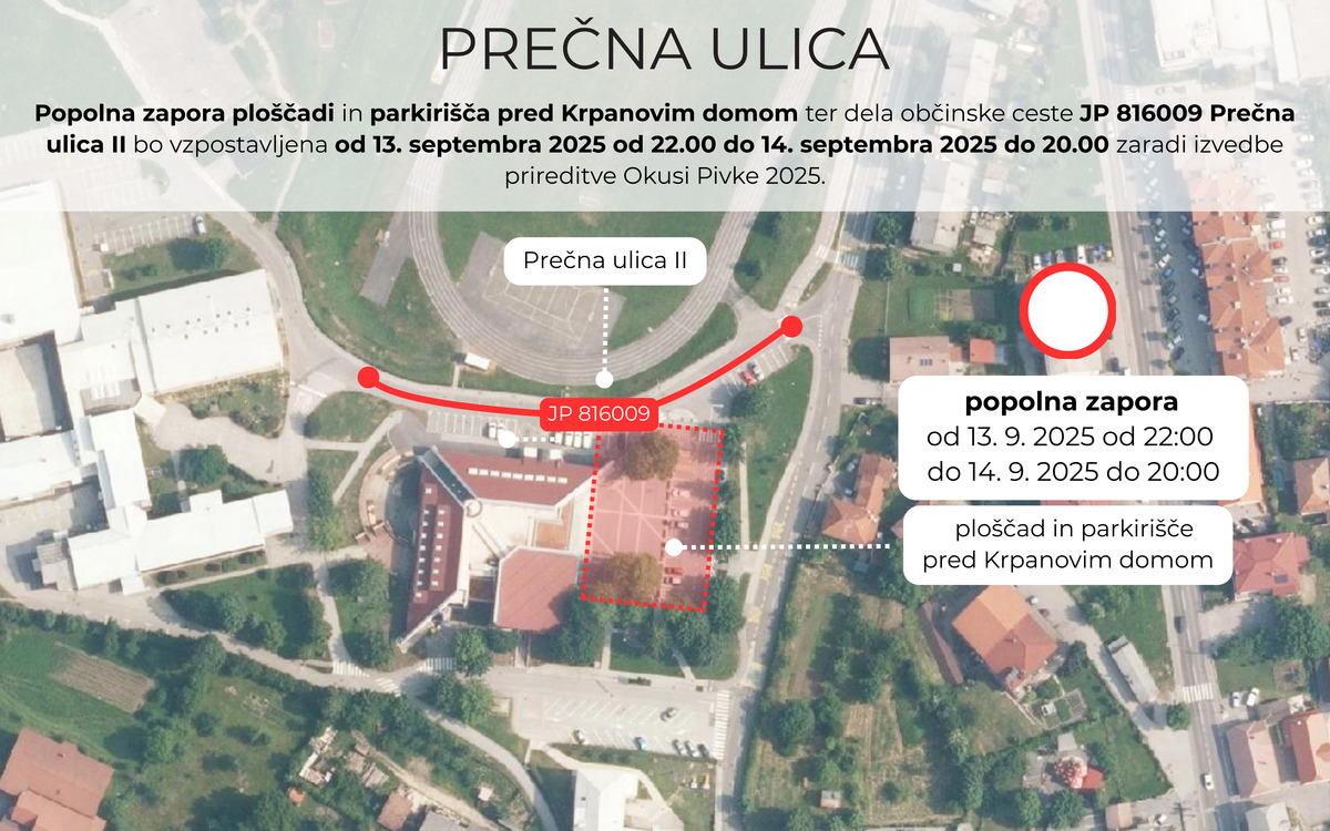 Občina Pivka obvešča, da bo zaradi izvedbe prireditve Okusi Pivke 2025 vzpostavljena popolna zapora ploščadi in parkirišča pred Krpanovim domom ter dela občinske ceste JP 816009 Prečna ulica II.