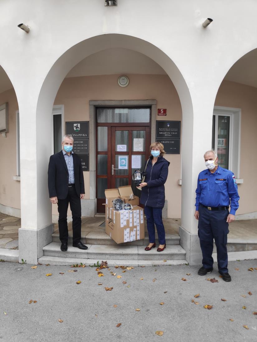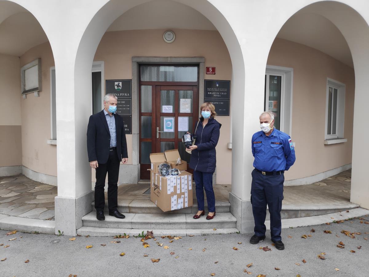 Včeraj sta Poveljnik CZ Občine Pivka Jože Morel in župan Občine Pivka Robert Smrdelj predala zaščitna sredstva direktorici ZD doma Postojna ga. prim. Ireni Vatovec.