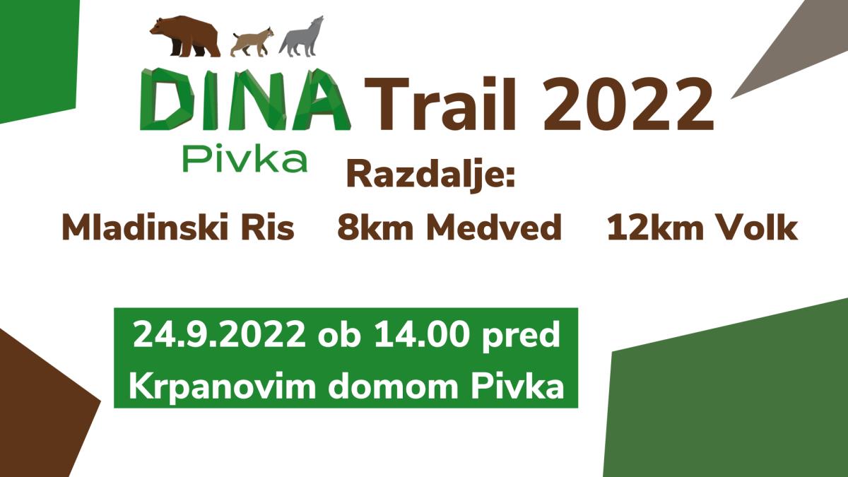 Pozdravljeni tekači! Dina trail tek je prireditev, ki vas bo z raznolikostjo proge navdušila nad slikovito pokrajino, ki jo prinaša Zeleni kras. Začne se v Pivki pred centrom Dina (Krpanov dom Pivka) in vas vodi do okoliških vrhov s čudovitim razgledom. Dina trail ima na voljo kar štiri discipline: Mladinski Ris, Medved, Volk in Dinin družinski tek za vse.