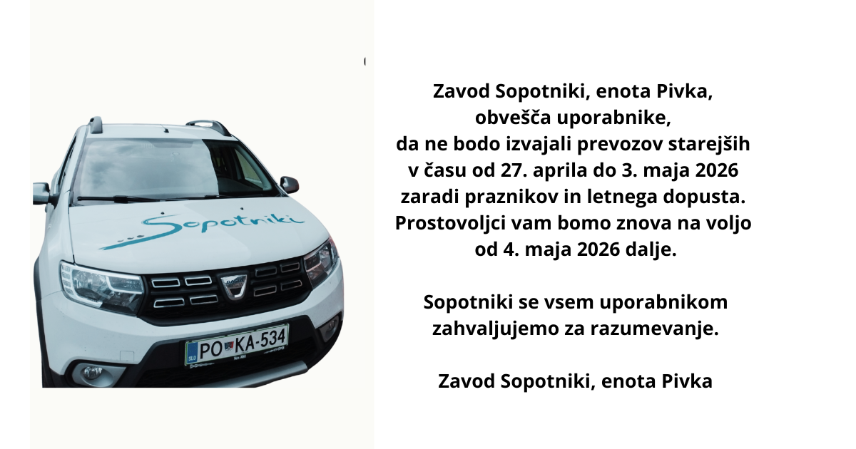 Zavod Sopotniki, enota Pivka, obvešča uporabnike, da ne bodo izvajali prevozov starejših v času od 27. aprila do 3. maja 2026 zaradi praznikov in letnega dopusta. Prostovoljci vam bomo znova na voljo od 4. maja 2026 dalje.