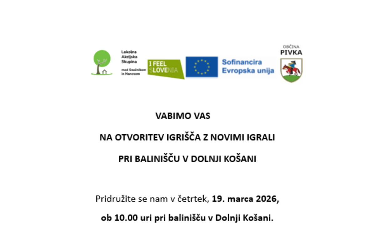 Občina Pivka vabi na otvoritev igrišča z novimi igrali pri balinišču v Dolnji Košani. Pridružite se nam v četrtek, 19. marca 2026, ob 10.00 uri pri balinišču v Dolnji Košani. Novo igrišče bomo otvorili skupaj z otroci iz Osnovne šole Košana.