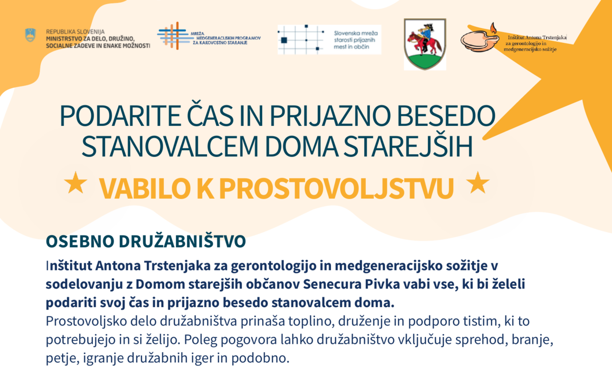 Inštitut Antona Trstenjaka za gerontologijo in medgeneracijsko sožitje v sodelovanju z Domom starejših občanov Senecura Pivka vabi vse, ki bi želeli podariti svoj čas in prijazno besedo stanovalcem doma.