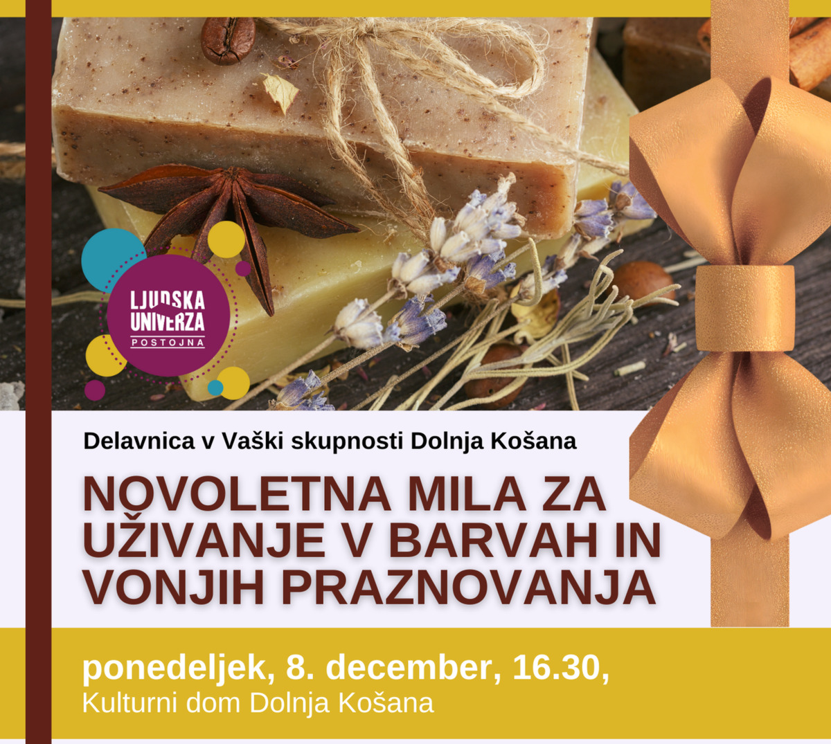 Delavnica je pravo doživetje barv, bleščic in omamnih vonjav! Skupaj bomo ustvarjali čudovita, malce kičasta božična in novoletna mila – popolna za obdarovanje ali razvajanju samih sebe. Mila bomo izdelali iz kakovostne SOAPBASE osnove, ki ji bomo dodali kozmetične dodatke, kot so dišave, gline, barvila in seveda bleščice. Posebno čarobnost pa mila dobijo z dodatkom posušenega travniškega cvetja, ki v prosojni bazi ustvari resnično osupljiv, naraven videz. Vsak udeleženec na delavnici ustvari tri unikatna mila, ki jih po zaključku ponosno odnese domov.