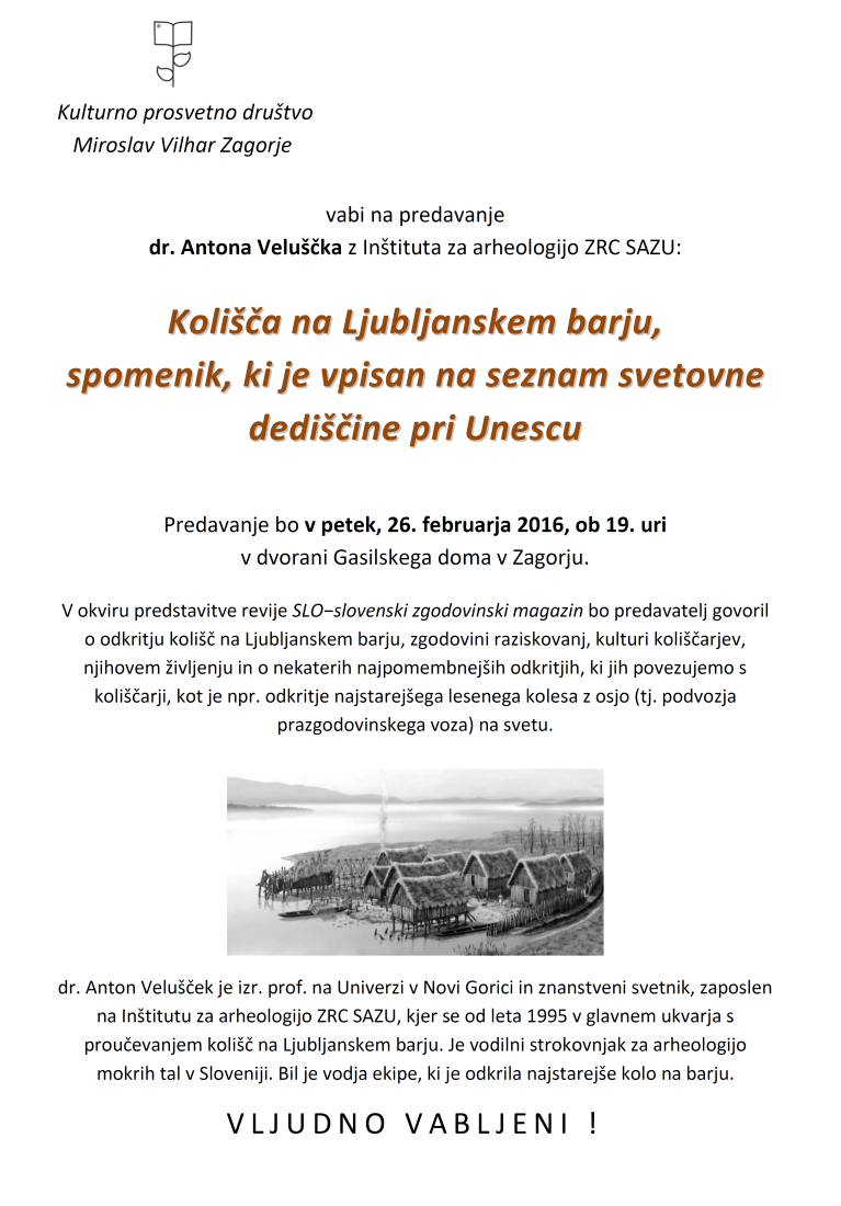Kulturno prosvetno društvo Miroslav Vilhar Zagorje vabi na predavanje dr. Antona Veluščka z Inštituta za arheologijo ZRC SAZU: