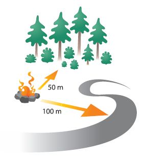 4. od pomembnih prometnih poti, večjih naselij in objektov z vnetljivimi ali nevarnimi snovmi mora biti kurišče oddaljeno vsaj 100 m;