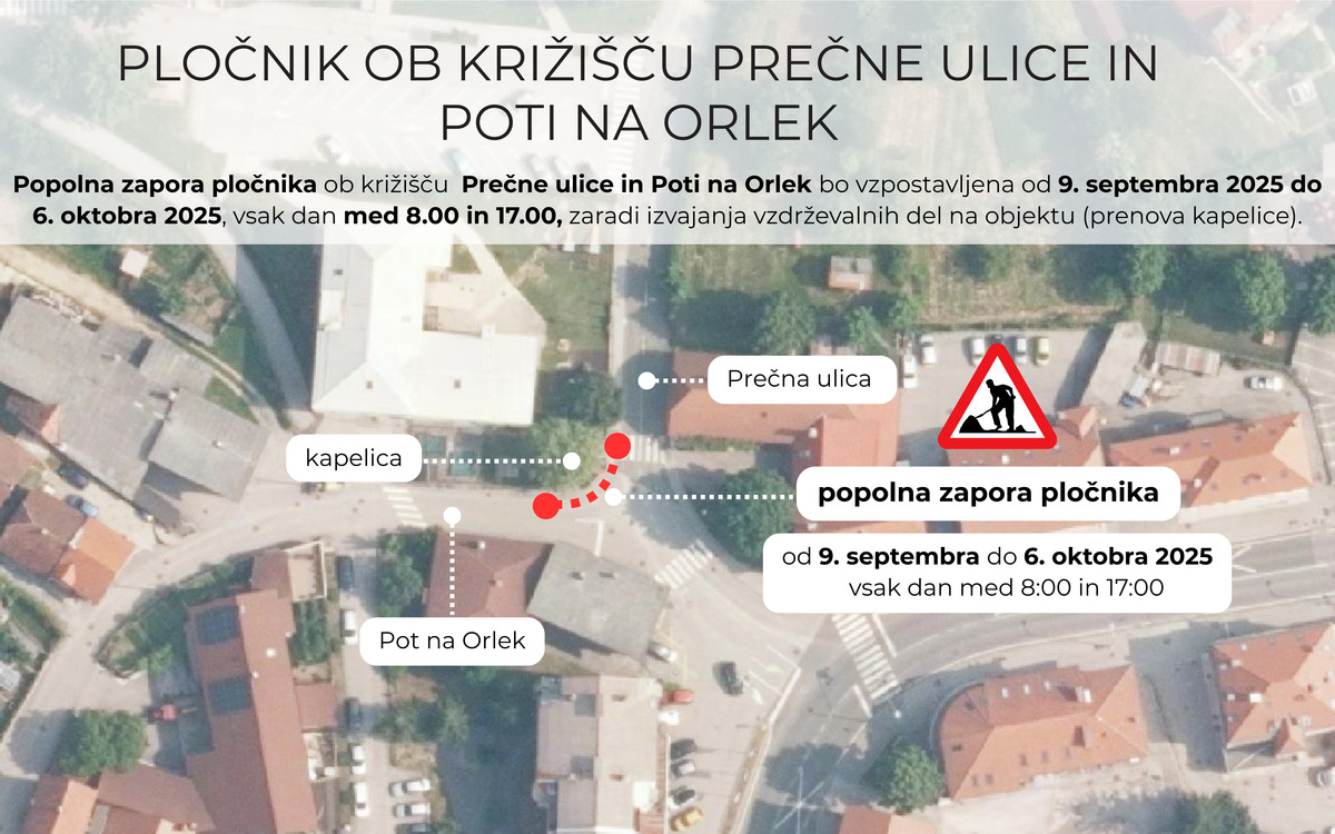 Občina Pivka obvešča, da bo zaradi izvedbe vzdrževalnih del na objektu (prenova kapelice) popolna zapora pločnika ob križišču JP 816011 Pot na Orlek in LZ 315231 Prečna ulica – Kolodvorska cesta.