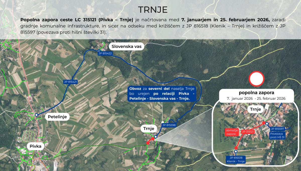 Obveščamo vas, da se popolna zapora ceste LC 315121 Pivka – Trnje na odseku med križiščem z JP 816518 (Klenik – Trnje) in križiščem z JP 815597 (povezava proti hišni številki 31) podaljšuje do 25. februarja 2026.