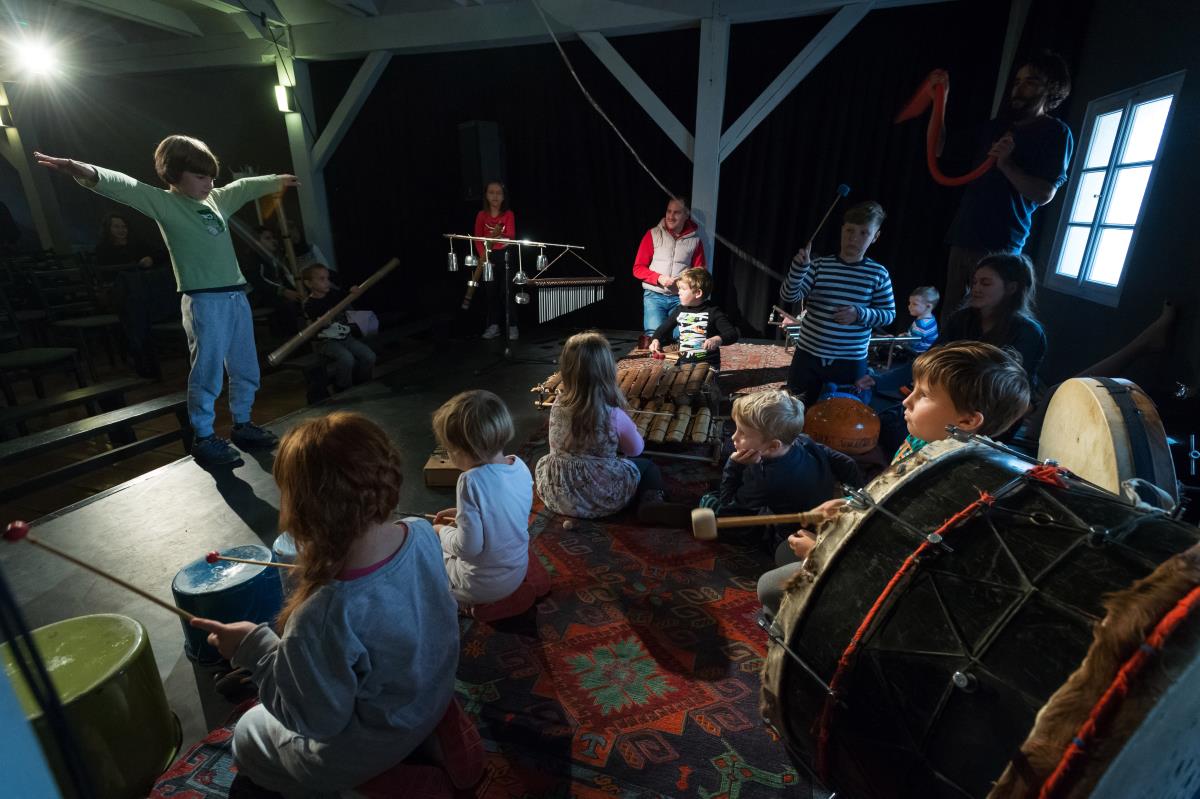 V drugem delu performansa so otroci – obogateni z zgodbo - povabljeni k igranju glasbil iz recikliranih materialov. V inštrumentariju »škratjega orkestra« se znajdejo kamenofon, balafon, cevofon, harfa, kalimbe, balunofoni, ropotulje, ektare, kazuji in tank drum, pri oponašanju škratovskih in živalskih glasov pa ne gre brez balonov, lepilnega traku in steklenic. Tako otroci iz »poslušalcev« postanejo »soustvarjalci« zgodbe, aktivno doživetje pa jih spodbuja tudi k refleksiji sporočila o našem odnosu do narave ter k temu, da lahko zvoke in glasbo ustvarjajo tudi iz nekonvencionalnih inštrumentov ter celo vsakdanjih reči, ki zazvenijo povsem na novo.