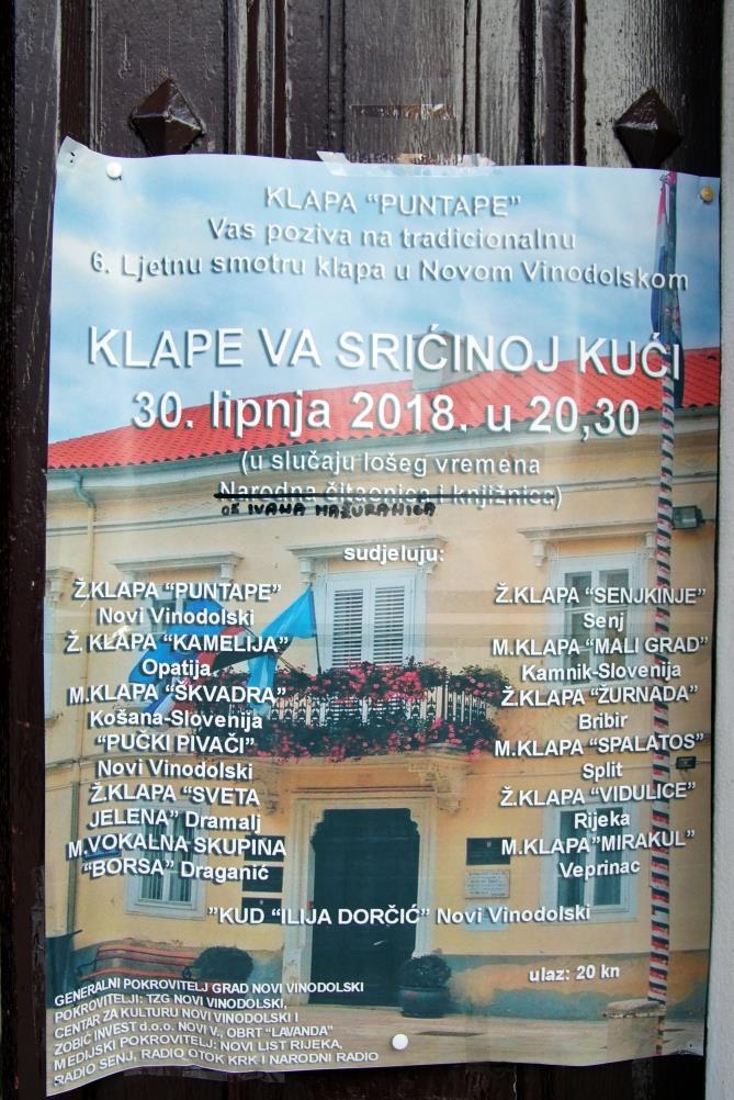 Na povabilo domače ženske klape Puntape je v soboto 30.6.2018 klapa Škvadra gostovala v Novem Vinodolskem. V prelepem ambientu na dvorišču Srićine kuće v centru Novega Vinodolskega je potekalo srečanje klap pod imenom »Klape v Srićinoj kući«.