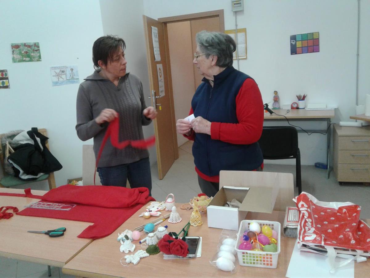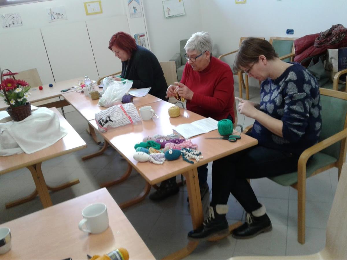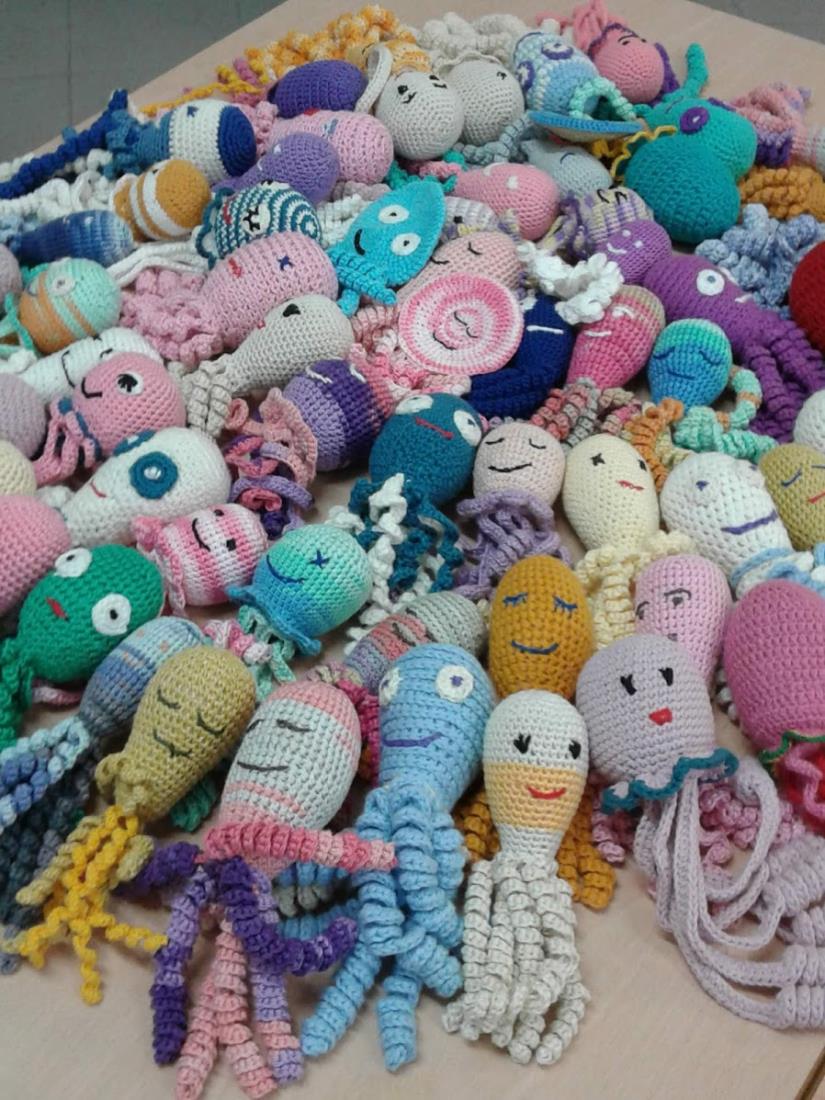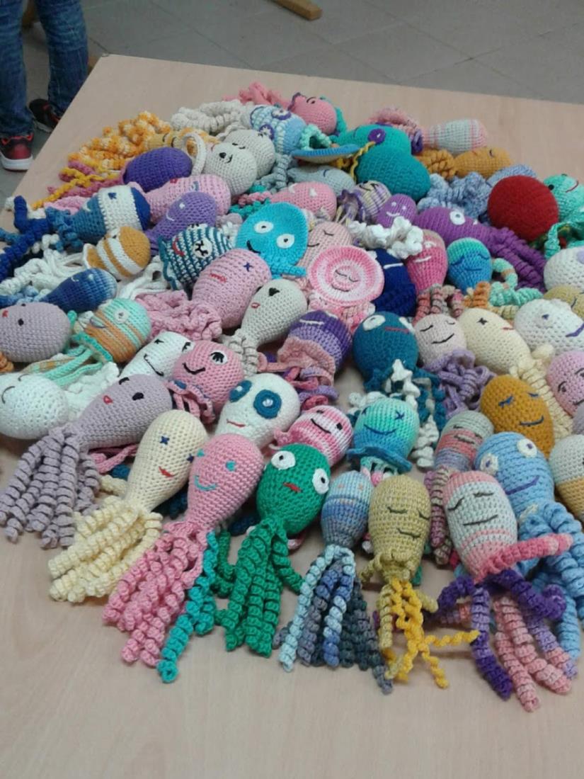 Romana, Tina, Jožica, Sandra, Štefka, Mira, Draguška, Rita in ne nazadnje naša starosta Milka Rebec smo se celo pomlad srečevale vsak petek dopoldne . Izmenjevale smo si izkušnje, učile druga drugo in primerjale narejene izdelke. Poleg dela smo si skuhale še kakšno kavo, se pogovarjale o različnih stvareh in se obilno smejale. Veliko dela smo opravile tudi doma, saj so bili petki prekratki, kvačke pa so nas v tem času zasvojile. Sklenile smo, da bomo šle s koncem šolskega leta tudi me na počitnice. Še prej smo preštele narejene izdelke. Na mizi se je nabralo 60 hobotnic in meduz, ki smo jih poslale v porodnišnice v Ljubljano, Maribor in Kranj.