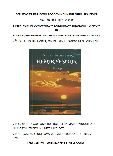VABILO NA KULTURNI VEČER S PESNIKOM IN DUHOVNIKOM DOMINIKOM BIZJAKOM - DINKOM