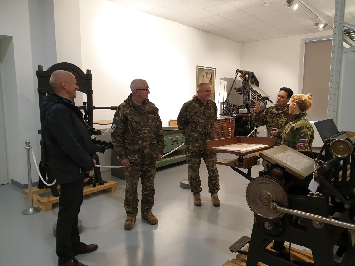 Park vojaške zgodovine sta v torek, 9. aprila, obiskala poveljnik Centra vojaških šol brigadir Milko Petek in poveljnik Vojaškega muzeja Slovenske vojske polkovnik Zoran Vobič s sodelavci. Delegacijo je na delovnem obisku sprejel direktor Parka Janko Boštjančič, ki je pomembnim vojaškim predstavnikom predstavil razvojno pot samega projekta v njegov današnji obseg, aktualno muzejsko ponudbo ter načrte in vizijo za nadaljnji razvoj Parka. Beseda je tekla tudi o zglednem dosedanjem sodelovanju med Slovensko vojsko in Parkom vojaške zgodovine ter načrtih in možnostih za nadaljnja sodelovanja in krepitev medsebojnih odnosov. Visoki gostje so se po zaključenih pogovorih podali še na ogled zbirk in razstav. Pri tem je bil poseben poudarek dan aktualnim razstavam o vojnih ujetnikih carske Rusije med prvo svetovno vojno na slovenskem ozemlju, topografskih kartah, partizanskih bolnišnicah v Kočevskem rogu in padlih ameriških letalih med drugo svetovno vojno na slovenskem ozemlju. Delovni obisk so zaokrožili še z ogledom depojskega kompleksa treh nacionalnih muzejev – Muzeja novejše zgodovine Slovenije, Tehniškega muzeja Slovenije in Narodnega muzeja Slovenije, kjer so se seznanili z dragocenimi eksponati in samim delovanjem depojskega objekta. Brigadir Petek in polkovnik Vobič sta ob tej priložnosti Parku vojaške zgodovine izrazila vse pohvale za dosedanje dosežke ter poudarila željo po še tesnejšem sodelovanju v prihodnje.