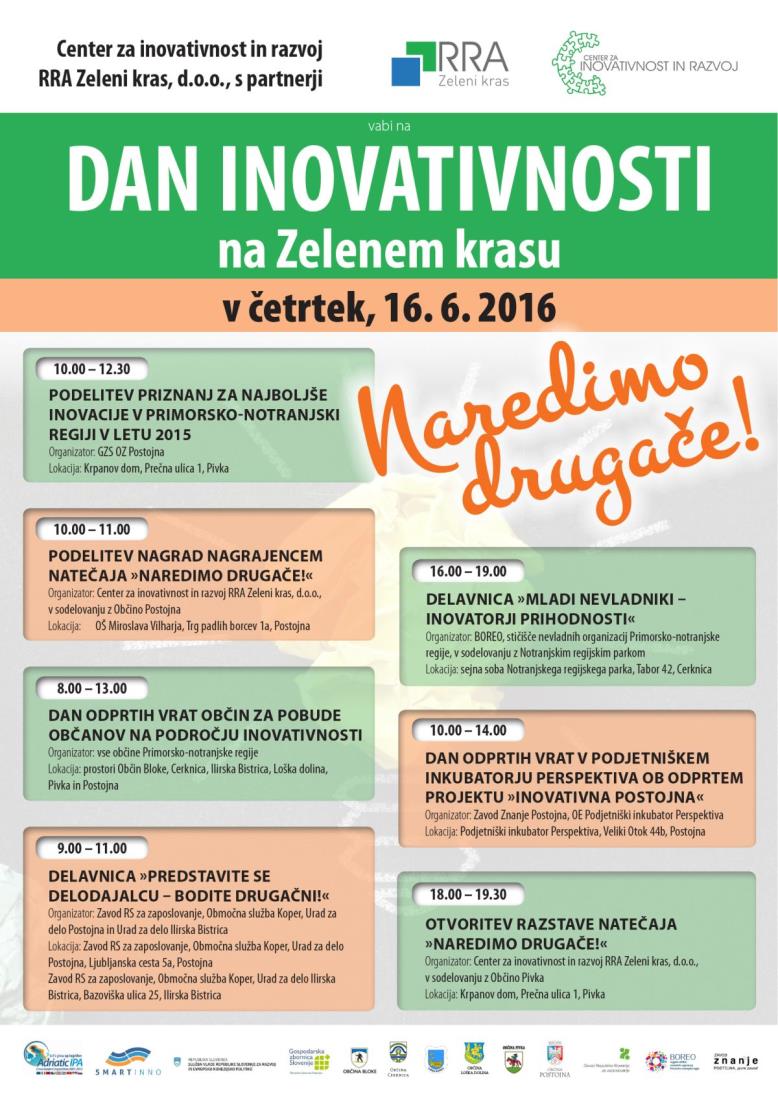 Na regijski dan inovativnosti bo v avli Krpanovega doma v Pivki ob 10. uri tudi slavnostna podelitev priznanj za najboljše inovacije v Primorsko-notranjski regiji za leto 2015, ki jo organizirata območna gospodarska zbornica in RRA Zeleni kras. Več v priloženem programu prireditve.