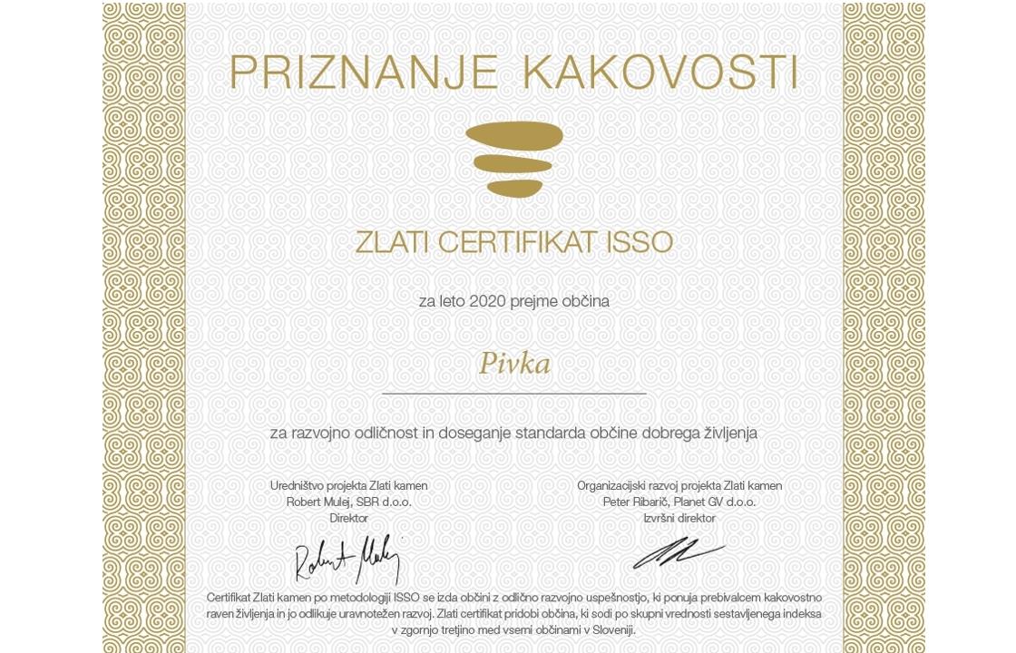 Občina Pivka se je uvrstila v zgornjo tretjino vseh slovenskih občin, ki ponujajo prebivalcem kakovostno raven življenja in jih odlikuje solidna in uravnotežena stopnja doseženega razvoja in je prejemnica ZLATEGA ISSO certifikata razvojne odličnosti za leto 2020.
