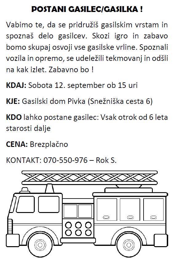 Vabimo te, da se pridružiš gasilskim vrstam in spoznaš delo gasilcev. Skozi igro in zabavo bomo skupaj osvoji vse gasilske vrline. Spoznali vozila in opremo, se udeležili tekmovanj in odšli na kak izlet. Zabavno bo !