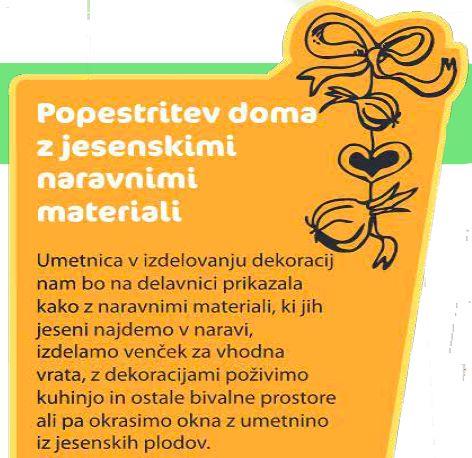 Tokrat bomo s pomočjo izkušene umetnice v izdelovanju dekoracij dobili zamisli ter nasvete, kako z jesenskimi materiali, ki nas obdajajo, olepšati svoje prostore in domove.