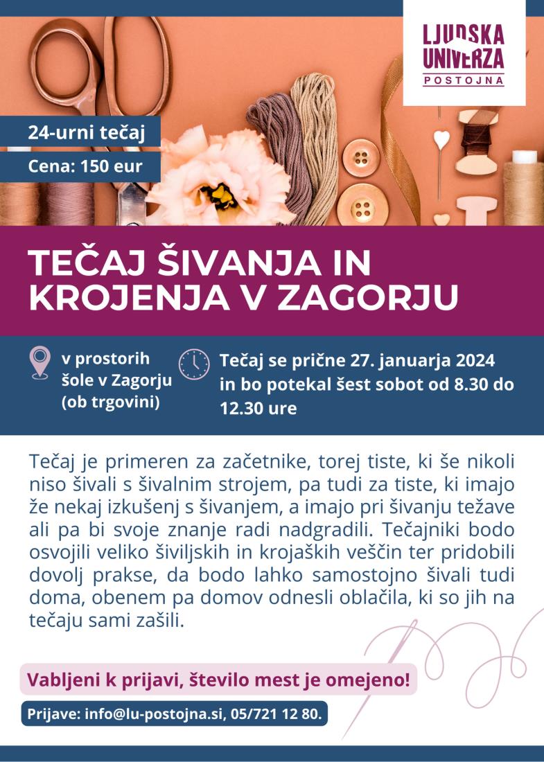 Tečaj je primeren za začetnike, torej tiste, ki še nikoli niso šivali s šivalnim strojem, pa tudi za tiste, ki imajo že nekaj izkušenj s šivanjem, a imajo pri šivanju težave ali pa bi svoje znanje radi nadgradili. Tečajniki bodo osvojili veliko šiviljskih in krojaških veščin ter pridobili dovolj prakse, da bodo lahko samostojno šivali tudi doma, obenem pa domov odnesli oblačila, ki so jih na tečaju sami zašili.