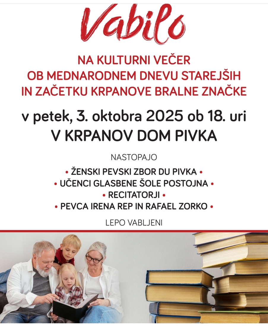 Društvo upokojencev Pivka in krožek Beremo skupaj vabita na kulturni večer ob Mednarodnem dnevu starejših ter ob začetku Krpanove bralne značke. Dogodek bo v petek, 3. oktobra 2025, ob 18. uri v Krpanovem domu v Pivki. Na prireditvi bodo nastopili Ženski pevski zbor DU Pivka, učenci Glasbene šole Postojna, recitatorji ter pevca Irena Rep in Rafael Zorko.