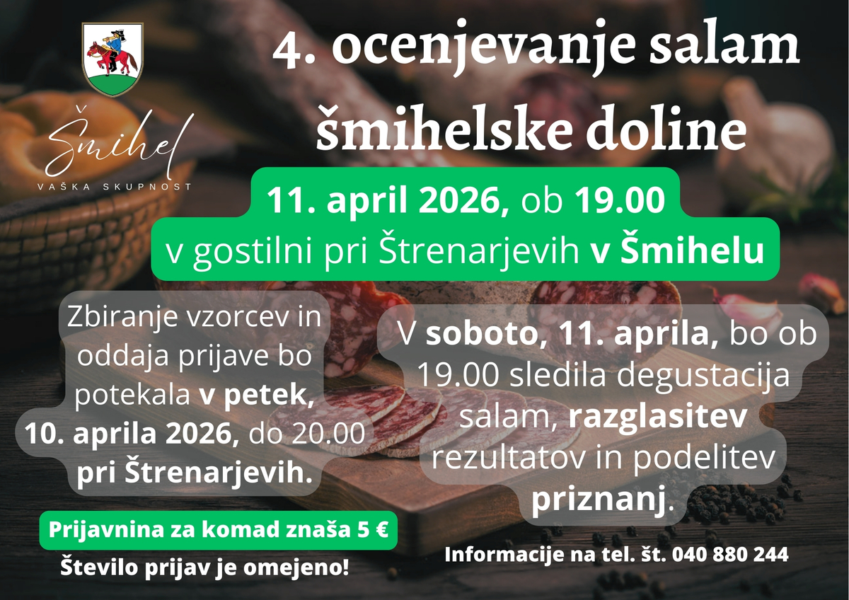 Vaška skupnost Šmihel vabi na 4. ocenjevanje salam Šmihelske doline, ki bo 11. aprila 2026, ob 19.00 v gostilni pri Štrenarjevih v Šmihelu.