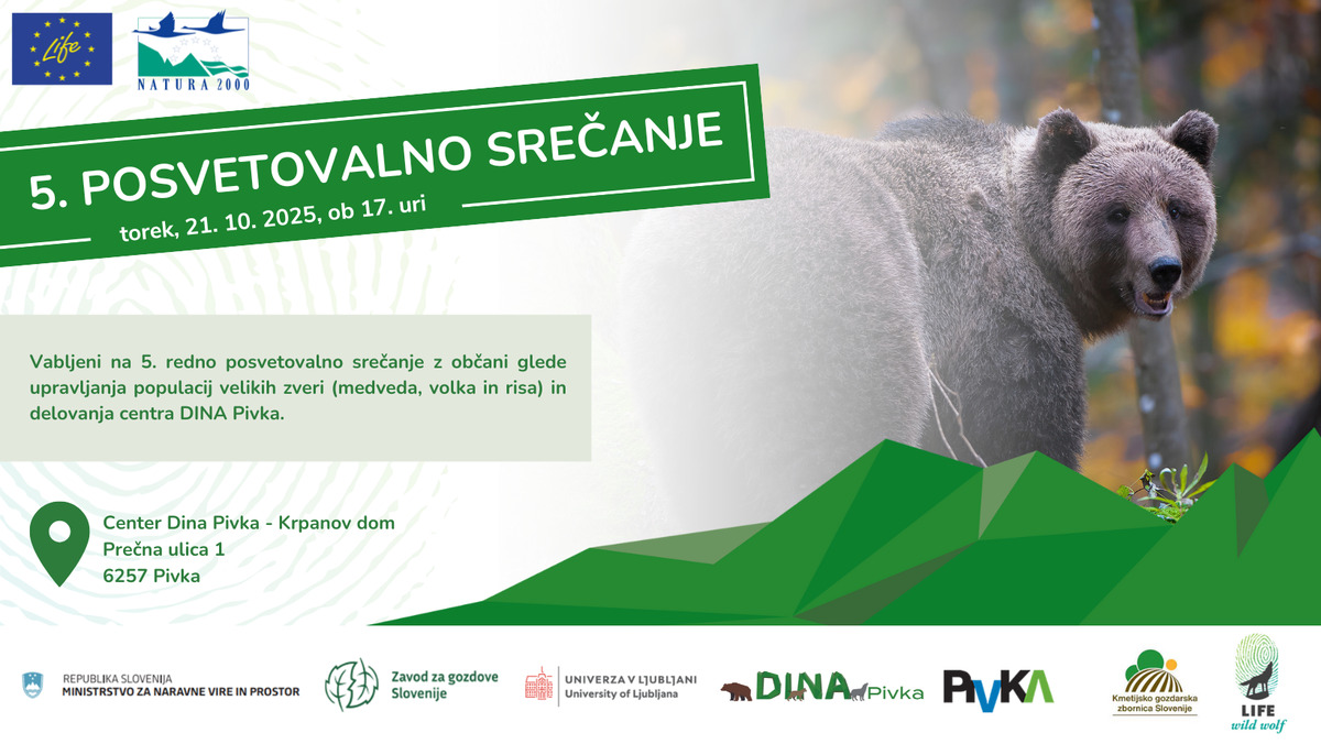 Vabimo vas na peto srečanje, ki bo potekalo v torek, 21. oktobra 2025, ob 17. uri, v sejni sobi Centra za velike zveri DINA Pivka.