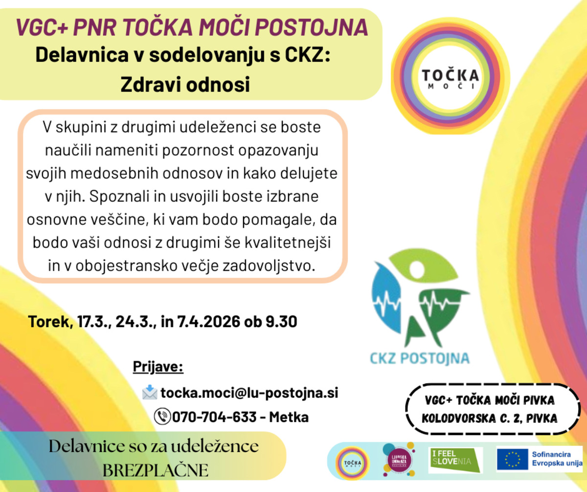 VGC+ PNR Točka moči Postojna organizira delavnico v sodelovanju s CKZ z naslovom Zdravi odnosi. V skupini z drugimi udeleženci se boste naučili nameniti več pozornosti opazovanju svojih medosebnih odnosov ter razmisliti o tem, kako v njih delujete. Spoznali in usvojili boste izbrane osnovne veščine, ki vam bodo pomagale, da bodo vaši odnosi z drugimi še kakovostnejši ter prinašali več obojestranskega zadovoljstva.