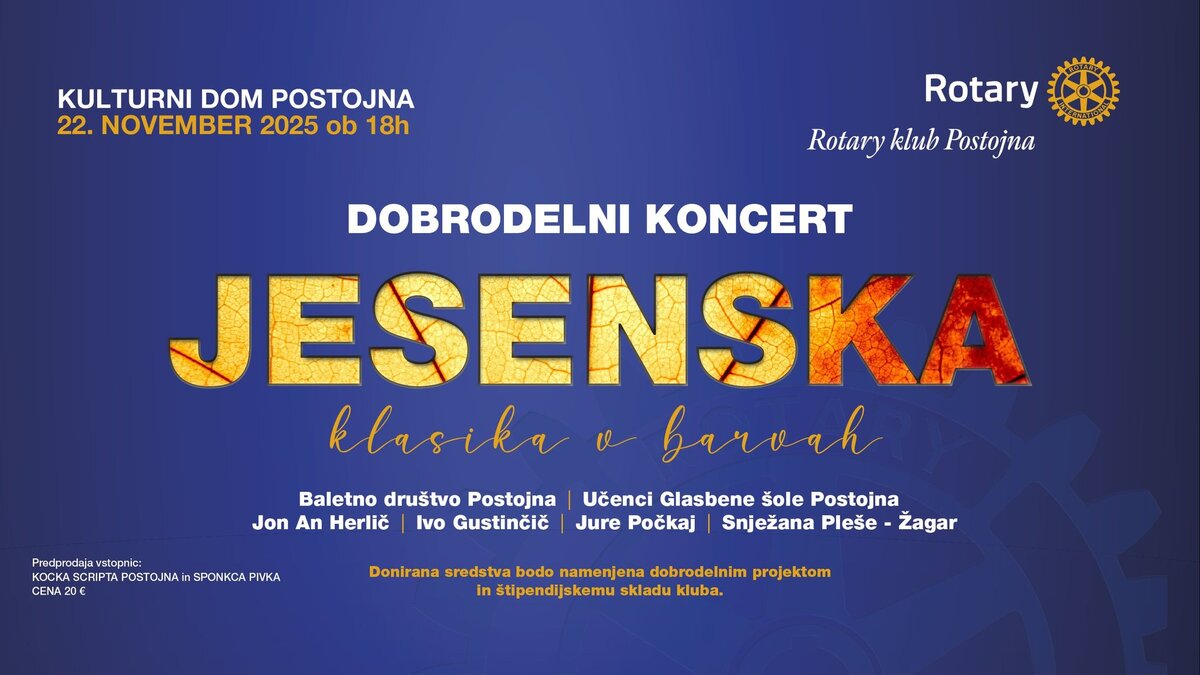 Rotary klub Postojna prireja tradicionalni novembrski dobrodelni koncert Jesenska klasika v barvah, s katerim bodo zbirali finančna sredstva za dobrodelne projekte in štipendijski sklad kluba.