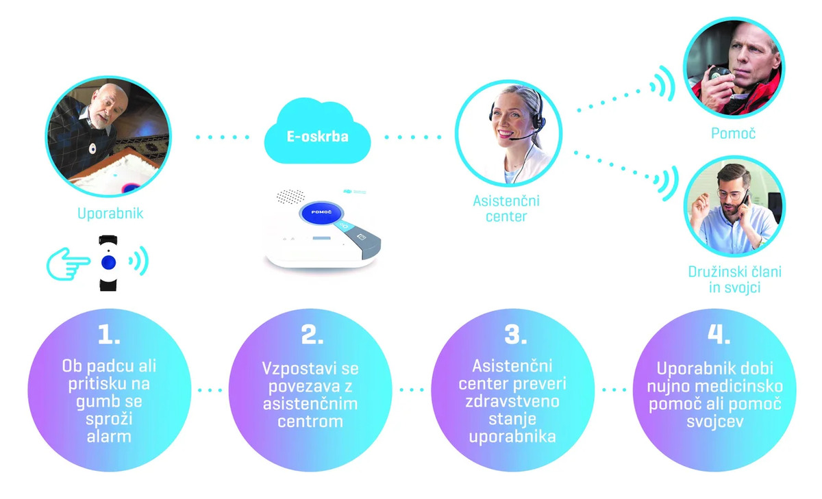 E-oskrba je storitev, ki prek varovalnega telefona in stalne povezanosti z asistenčnim centrom zagotavlja takojšnjo pomoč. Uporabniki enostavno nosijo kot zapestnico ali obesek na verižici, ki samodejno zazna padec in takoj sproži klic na pomoč. Na zapestnici in obesku lahko pritisnejo tudi na gumb in s tem pokličejo pomoč.