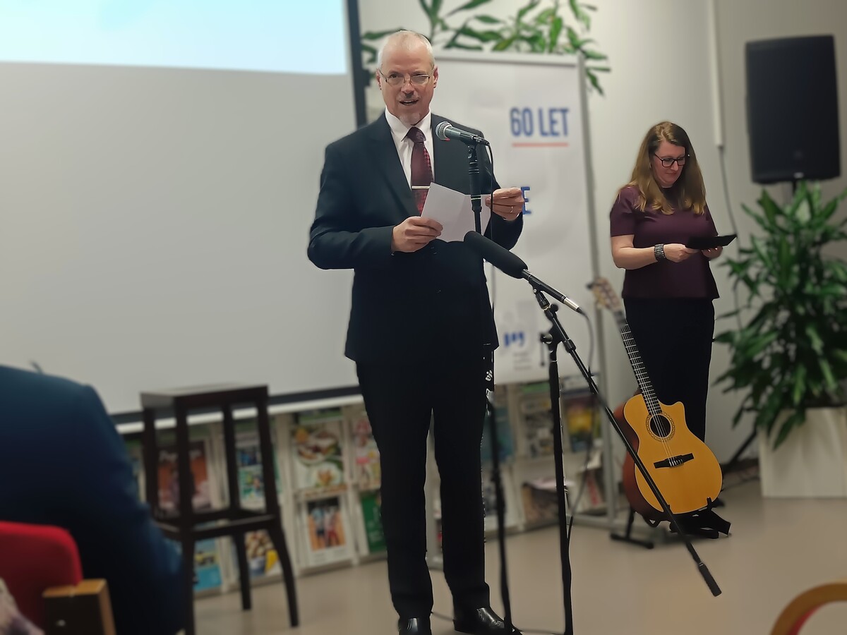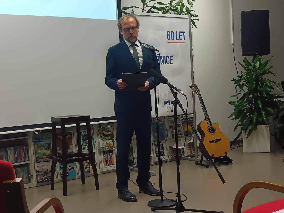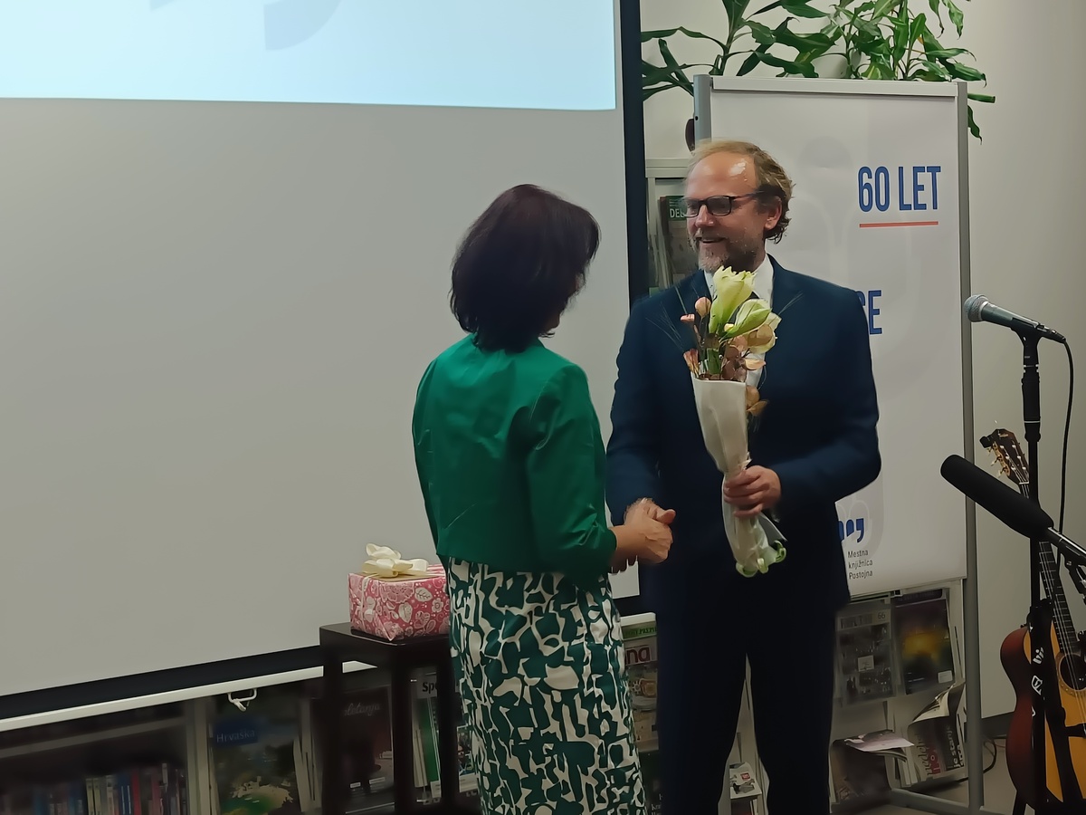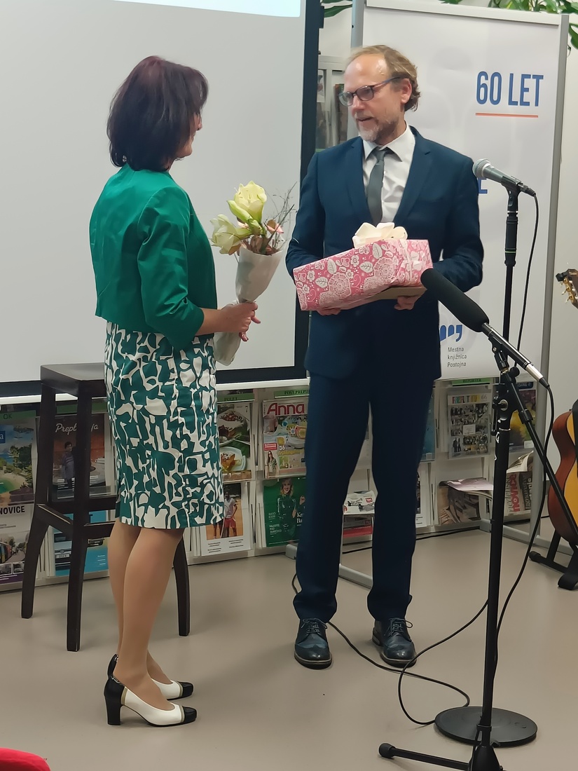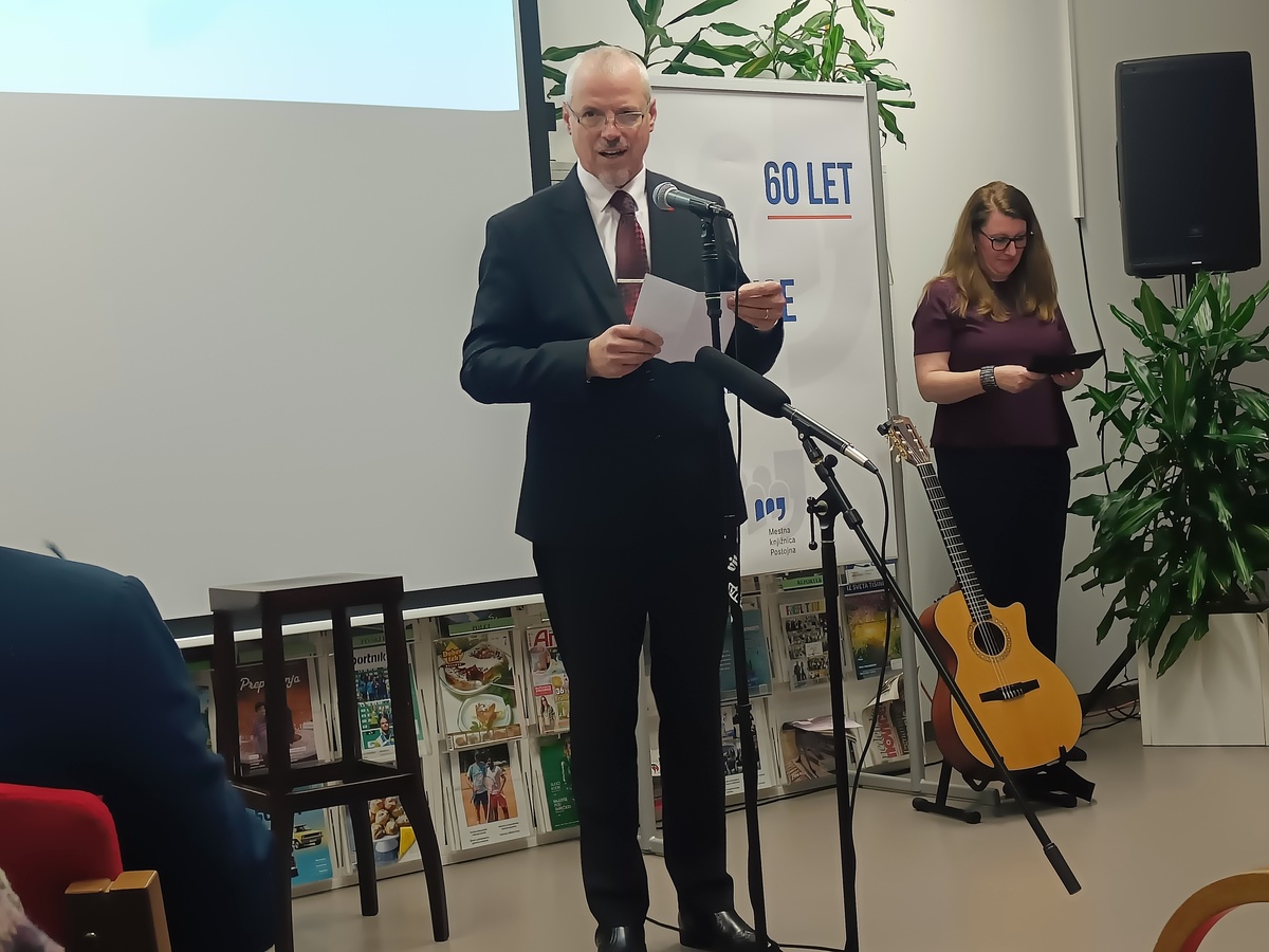 Mag. Uroš Mlinar je v nagovoru na kratko orisal razvoj knjižnice, ki sega v drugo polovico 20. stoletja. Pred letom 1965 so knjižnične zbirke delovale v krajevnih skupnostih, celo s kovčkom knjig, ki je krožil med hišami. Prva knjižnica je bila urejena na železniški postaji, kjer je na 32 kvadratnih metrih ponujala 4.198 knjig. Leta 1976 se je preselila v prostore Doma JLA, tri leta kasneje pa je dostopnost še izboljšal prvi bibliobus. Med osamosvojitveno vojno so morali 11 tisoč knjig ponovno preseliti na železniško postajo, kjer so ostale do leta 1994, ko je knjižnica zaživela v prenovljenem Krpanovem domu. Direktor Mestne knjižnice Postojna je izpostavil izzive, ki jih prinaša razvoj umetne inteligence. Poudaril je, da je vloga knjižnic kot zaupanja vrednih virov informacij ključna v času avtomatiziranih in pogosto nepreverjenih podatkov. Knjižnice bodo po njegovih besedah morale okrepiti informacijsko opismenjevanje ter uporabnike seznanjati s prednostmi in omejitvami umetne inteligence, pri tem pa posebno pozornost nameniti zaščiti zasebnosti. Kljub tehnološkim spremembam ostaja njihovo poslanstvo nespremenjeno – omogočati dostop do znanja, spodbujati kritično mišljenje in varovati kulturno dediščino, pri čemer naj bo umetna inteligenca le podporno orodje.