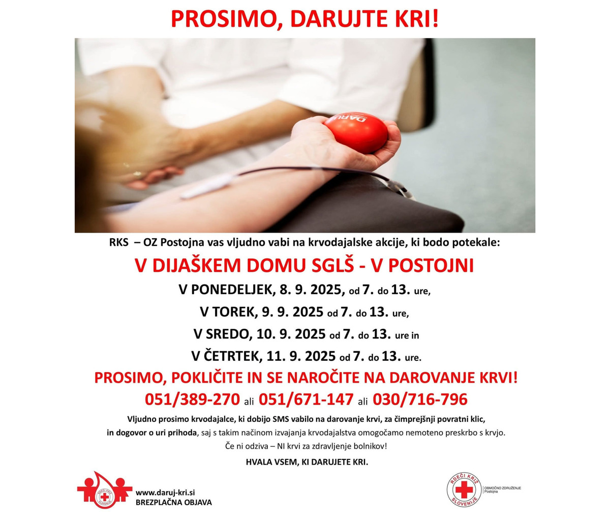 RKS – OZ Postojna vas vljudno vabi na krvodajalske akcije, ki bodo potekale: