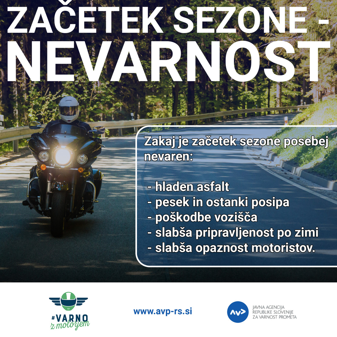 Topli in sončni dnevi so številne motoriste že privabili na ceste. Čeprav temperature čez dan že omogočajo vožnjo, zgodnjepomladanske razmere od voznikov motornih koles zahtevajo posebno previdnost, večjo zbranost in dobro pripravo. Prvi dnevi s temperaturami nad 15 stopinj so za najbolj zagrete in neučakane pogosto dovolj, da po dolgem zimskem premoru znova sedejo na motor. S tem ni nič narobe, vendar vožnja po večmesečnem premoru in po zimi – z vsemi njenimi posledicami za vozila in cestno infrastrukturo – prinaša posebne izzive, na katere morajo biti motoristi ustrezno pripravljeni.