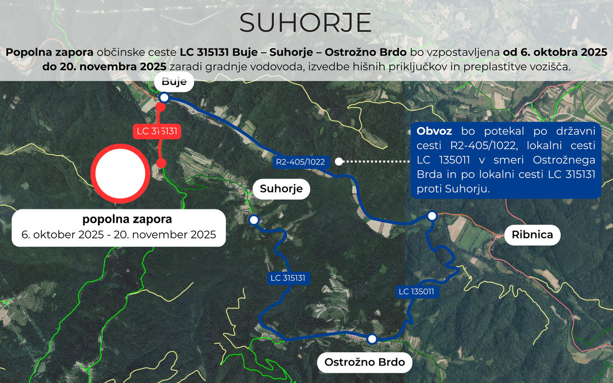 Obveščamo vas, da bo od 6. oktobra do 20. novembra 2025 vzpostavljena popolna zapora občinske ceste LC 315131 Buje – Suhorje – Ostrožno Brdo, in sicer na odseku od mosta z državno cesto R2-405 pri kraju Buje proti Suhorju, v dolžini približno 1.200 m.
