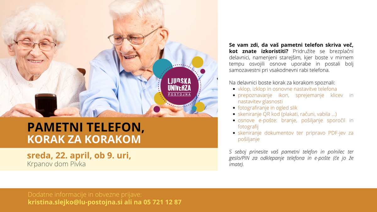 Se vam zdi, da vaš pametni telefon skriva več, kot znate izkoristiti? Pridružite se brezplačni delavnici, namenjeni starejšim, kjer boste v mirnem tempu osvojili osnove uporabe in postali bolj samozavestni pri vsakodnevni rabi telefona.