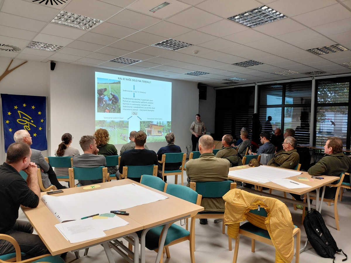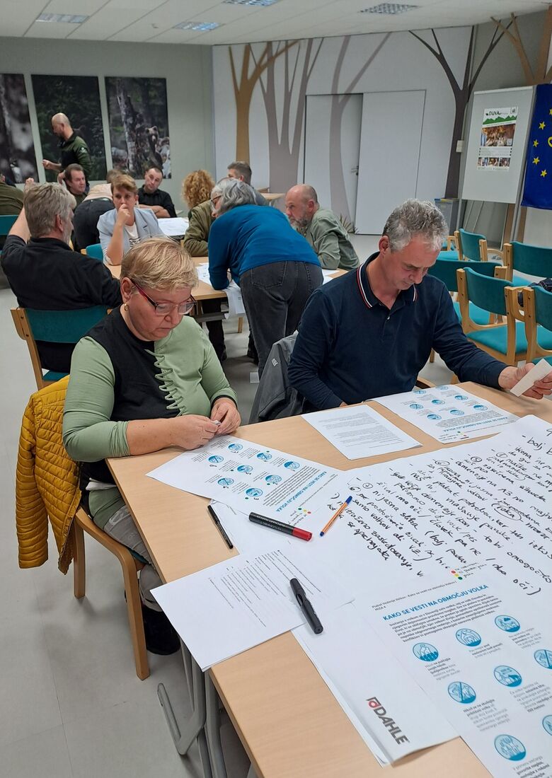 Srečanje se je zaključilo z delavnico o vsebini informativnega plakata »Vedenje volkov – Kako se vesti na območju volkov«, kjer so udeleženci prispevali dragocene praktične predloge za bolj razumljiva in uporabna navodila za obiskovalce narave in domačine.