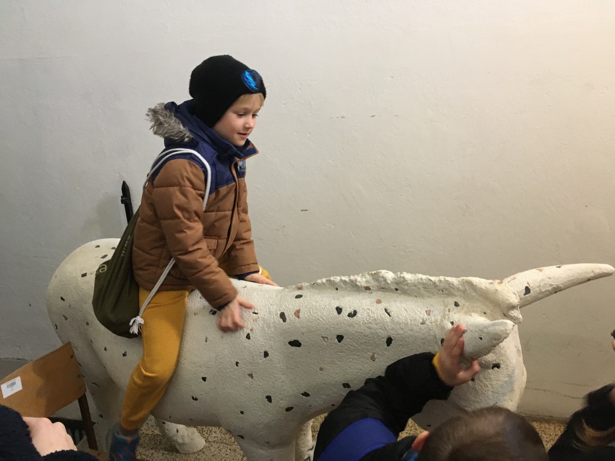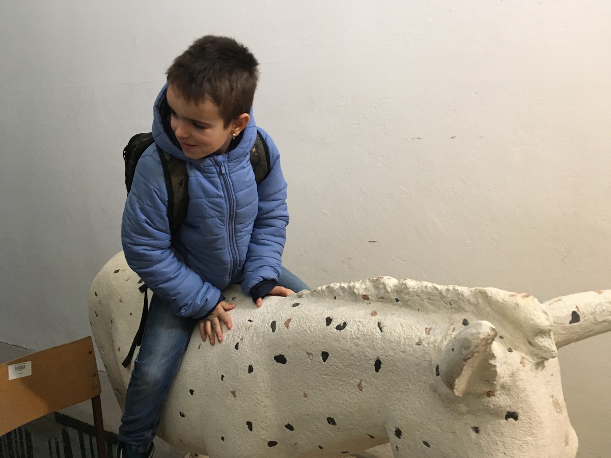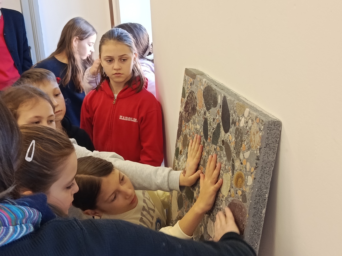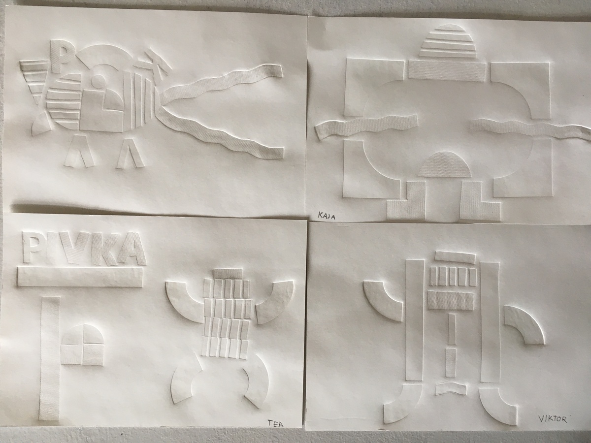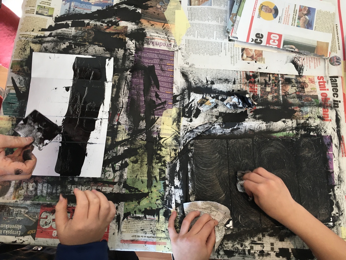 Vsakega od obiskov smo pričeli s sprehodom skozi razstavo kiparja Tomaža Furlana, kjer so otroci lahko preizkusili njegova dela. Nato smo se zbrali okrog miz v naši učilnici in spoznali nekaj osnovnih grafičnih pojmov. Preučili smo več umetnin, izdelanih v različnih grafičnih tehnikah, ugotavljali, zakaj je treba matrico ustvariti v zrcalni sliki, ter preštevali, koliko matric je potrebnih za en odtis. V igri opazovanja so otroci grafike povezali z ustreznimi matricami, pod lastnimi prsti pa so preizkusili še, kakšna je tekstura grafičnega sita.