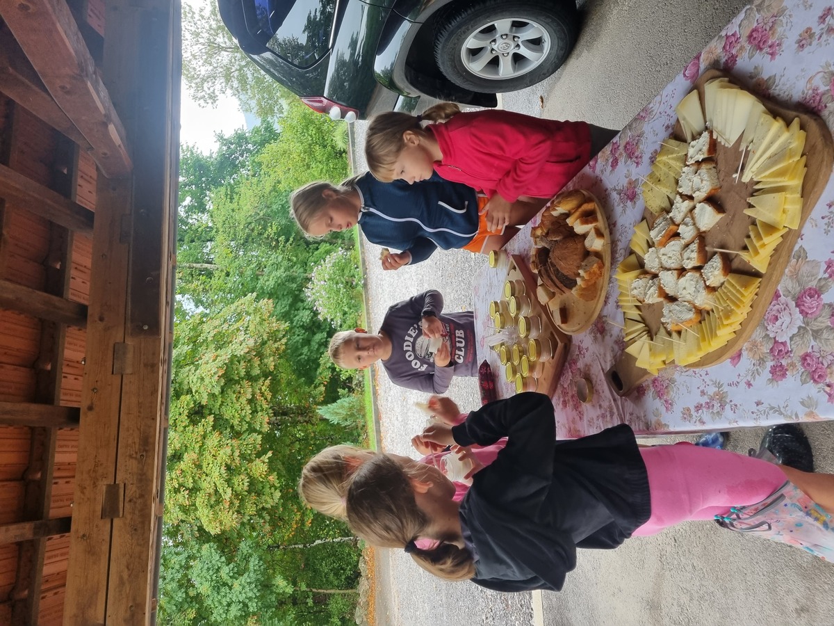 Nato smo se skupaj podali skozi Ekomuzej, kjer so skozi igro spoznavali zgodovino in tradicijo naših krajev, po ogledu pa smo se odpravili proti kmetiji Žužek. Tam nas je pričakala prijazna domača pogostitev – pristen okus podeželja. Ob vrnitvi pa je sledilo še pravo presenečenje: Martin Krpan je izpolnil svojo obljubo in vse otroke razveselil s sladoledom Kmetije Slavec.