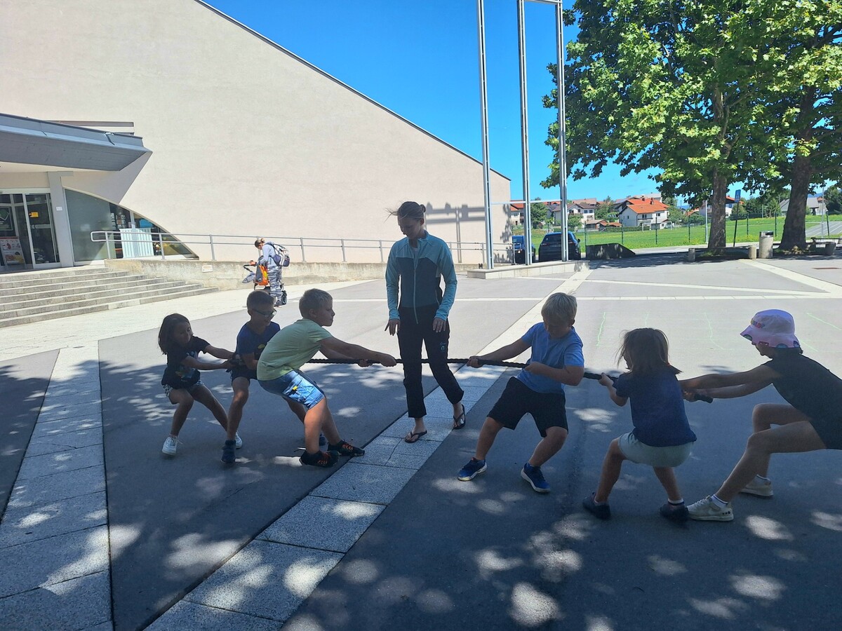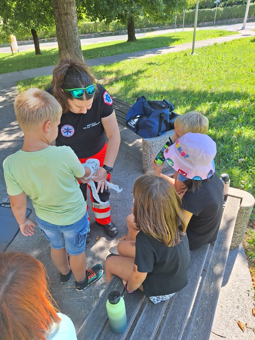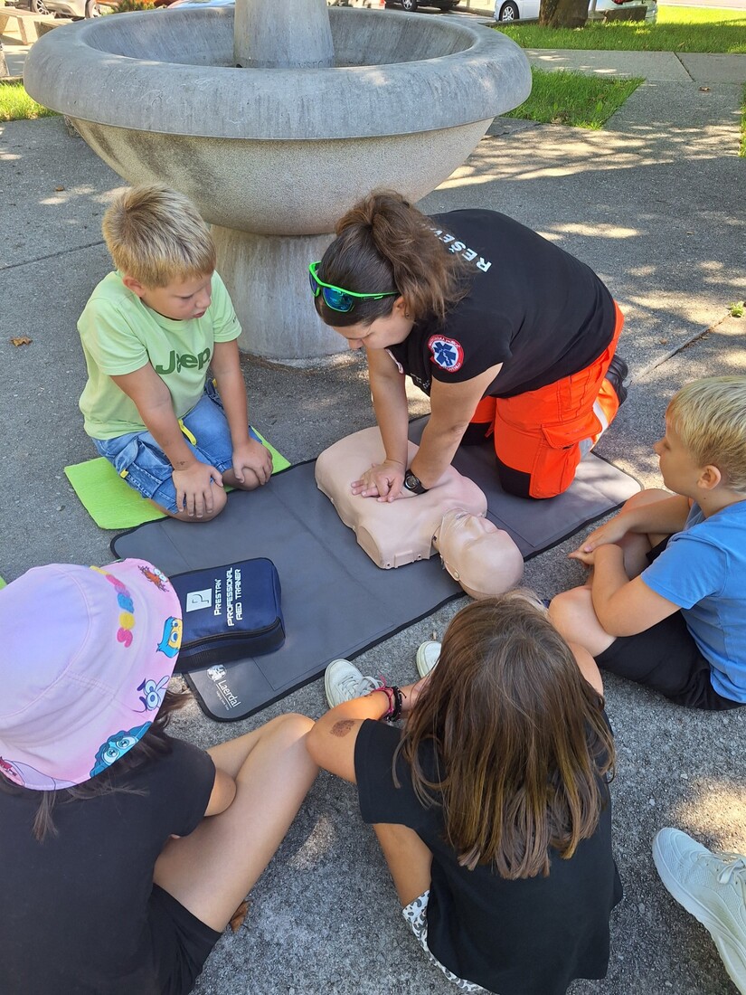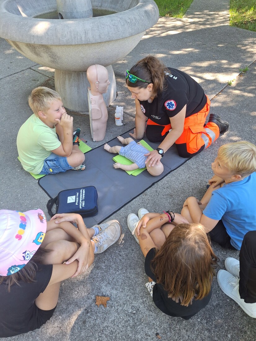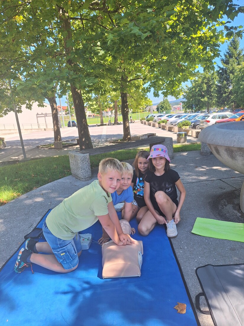 V drugem delu delavnic so otroci s pomočjo reševalke spoznavali temeljne postopke prve pomoči. Preizkusili so se v oživljanju odraslih in otrok, uporabi AED naprave, zaustavljanju krvavitev in imobilizaciji zlomov. Dopoldne smo zaključili z energičnima igroma Med dvema ognjema in vlečenjem vrvi.