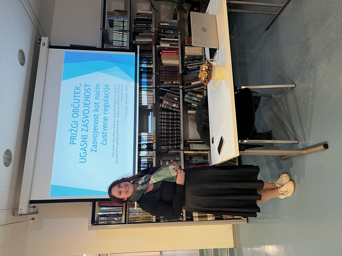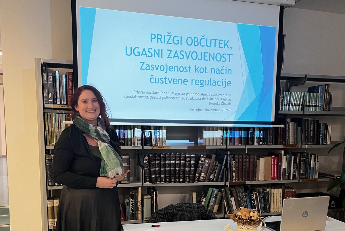V Društvu Projekt Človek v okviru meseca preprečevanja zasvojenosti organiziramo različne aktivnosti, o katerih si lahko več preberete na naši e-strani: www.projektclovek.si ali FB profilu. Eden izmed dogodkov, je bilo v ponedeljek, 10.11.2025, tudi predavanje, ki ga je organiziral Sprejemni center Piran v sodelovanju z Mestno knjižnico Postojna. Delavka iz naše Svetovalne pisarne v Novi Gorici, Sara Pipan, magistrica psihosocialnega svetovanja, v procesu zaključevanja drugega magisterija iz psihoterapevtske znanosti ter specializantka gestalt psihoterapije pod supervizijo, je pripravila zanimivo in po mnenju občinstva, tudi zelo aktualno predavanje z naslovom »Prižgi občutek in ugasni zasvojenost – Zasvojenost kot način čustvene regulacije.« Predavateljica je spregovorila o tem, da ko so čustva preplavljajoča, neobvladljiva ali nerazumljena, pogosto nimamo ustreznega jezika ali podpore, da bi jih lahko sprejeli in predelali. V takih trenutkih se lahko razvijejo različni mehanizmi preživetja, med njimi tudi zasvojenost, ki deluje kot poskus umirjanja notranje stiske in regulacije čustev. Preko predavanja so slušatelji raziskali, kako skozi življenje oblikujemo svoje načine čustvene regulacije. Posebno pozornost je predavateljica namenila vlogi zasvojenosti kot tihemu odzivu na notranjo stisko posameznika, ki poskuša omiliti bolečino tam, kjer stik s sabo, z drugimi in z življenjem ni varen ali pa je preveč boleč. Predavateljica je občinstvo povabila, da so skupaj iskali načine, kako prepoznati, razumeti in podpreti čustvene izzive, ki se skrivajo za zasvojenostjo ter kako se znova povezati s seboj in z življenjem.