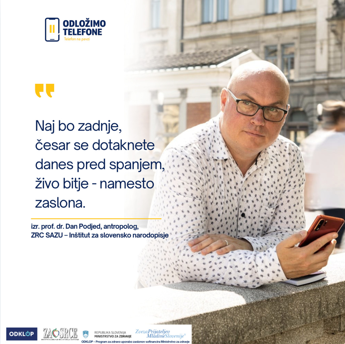 Zveza prijateljev mladine Slovenije (ZPMS) se s kampanjo vključuje v projekt ODKLOP – za zdravo uporabo zaslonov, ki ga vodi Društvo za zdravje srca in ožilja Slovenije. Projekt bo potekal do konca leta 2028 in ga sofinancira Ministrstvo za zdravje. Kampanja temelji na ideji digitalnega premora: zavestni odločitvi, da za določen čas umaknemo telefon iz ospredja. Kampanja ne zavrača in ne prepoveduje tehnologije, temveč spodbuja zavestno, odgovorno in varno rabo digitalnih zaslonov.